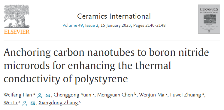 2023年1月15日,信誉最好的十大体育平台韩维坊老师在《 Ceramics International 》(中科院1区、TOP期刊)发表了题为 Anchoring carbon nanotubes to boron nitride microrods for enhancing the thermal conductivity of polystyrene 的研究论文,揭示了界面处的导热机理,从微观角度阐释了BN陶瓷和碳纳米管提高高分子材料导热性能的内在原因。