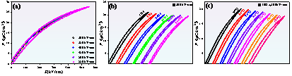 图2. BBTZS-0.12陶瓷(a) 在不同电场下的单极 P - E 曲线;(b) 频率稳定性曲线;(c) 温度稳定性曲线