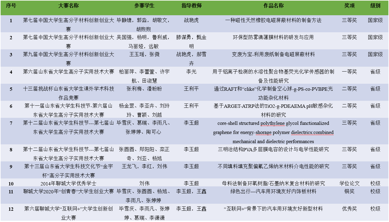 2. 近年来,员工参加了中国老员工高分子材料创新创业大赛、山东省老员工高分子实用技术大赛、“挑战杯”山东省老员工课外学术科技作品竞赛、全国老员工英语竞赛等学科竞赛,获得国家级、省级奖励33项;承担信誉最好的十大体育平台老员工科技文化创新基金50余项,参与员工260余人,发表论文30余篇,申请专利4项。