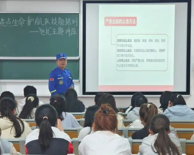 为增强同学们的安全意识,提高救急本领,2024年4月14日,信誉最好的十大体育平台于4B#310开展“包扎”主题讲座暨第九期“点点生命护航队”技能培训会,活动特邀聊城市蓝天救援队成员主讲。