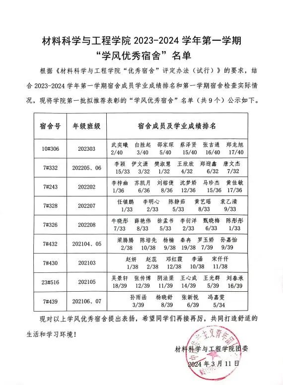 本次“学风优秀宿舍”评选活动是根据《信誉最好的十大体育平台“优秀宿舍”评定办法》的相关要求,结合2023-2024学年第一学期宿舍成员学业成绩排名和第一学期宿舍检查情况,最后评选出“学风优秀宿舍”共9间,分别是10#306、7#332、7#243、7#328、7#326、7#432、7#430、23#516、7#439宿舍。公司为以上“学风优秀宿舍”发放学习用品奖励,并为宿舍成员在综合测评中予以适当加分。