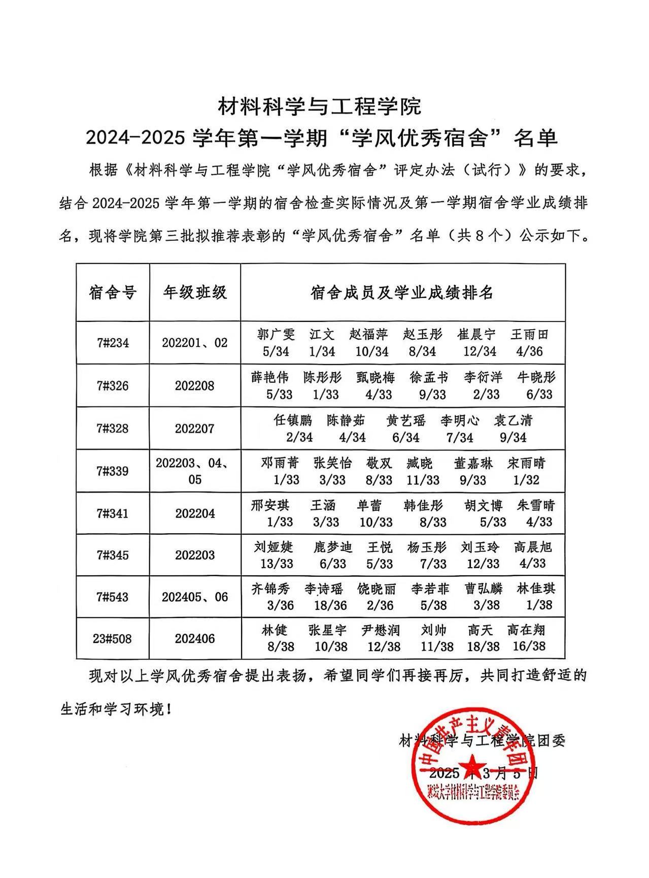 本次“学风优秀宿舍”评选活动是根据《信誉最好的十大体育平台“学风优秀宿舍”评定办法(试行)》的要求,结合2024-2025学年第一学期的宿舍检查实际情况及第一学期宿舍学业成绩排名,现将公司第三批拟推荐表彰的“学风优秀宿舍”名单(共8个)公示如下:7#234、7#326、7#328、7#339、7#341、7#345、7#543、23#508。公司为以上“学风优秀宿舍”发放学习用品奖励,并为宿舍成员在综合测评中予以适当加分。