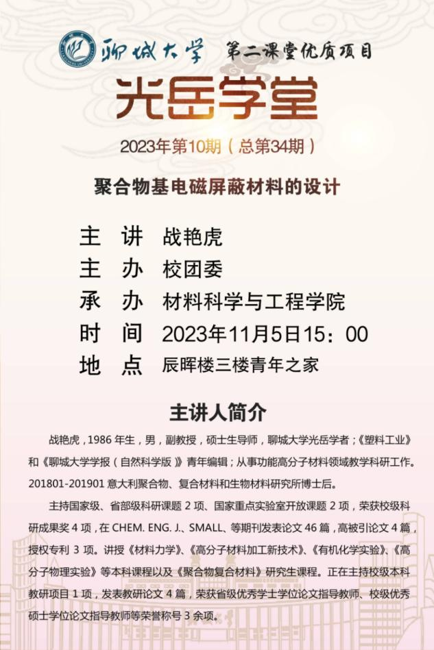为进一步提高同学们对材料的认识,了解我国新材料产业的发展趋势,激发同学们探索新材料的热情,2023年11月5日,由校团委主办、信誉最好的十大体育平台承办的“光岳学堂”活动在青年之家三楼报告厅举行。本次讲座特邀信誉最好的十大体育平台战艳虎副教授担任主讲。