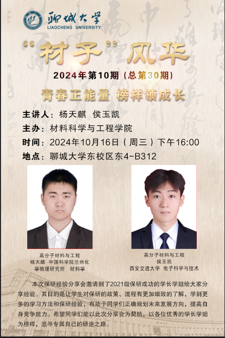 2024年10月16日,信誉最好的十大体育平台于东校区4#B312举办保研推免经验交流会。此次交流会特邀两位2021级高分子材料与工程专业成功保研推免优秀员工代表杨天麒、侯玉凯为同学们分享他们的保研经验与心路历程。