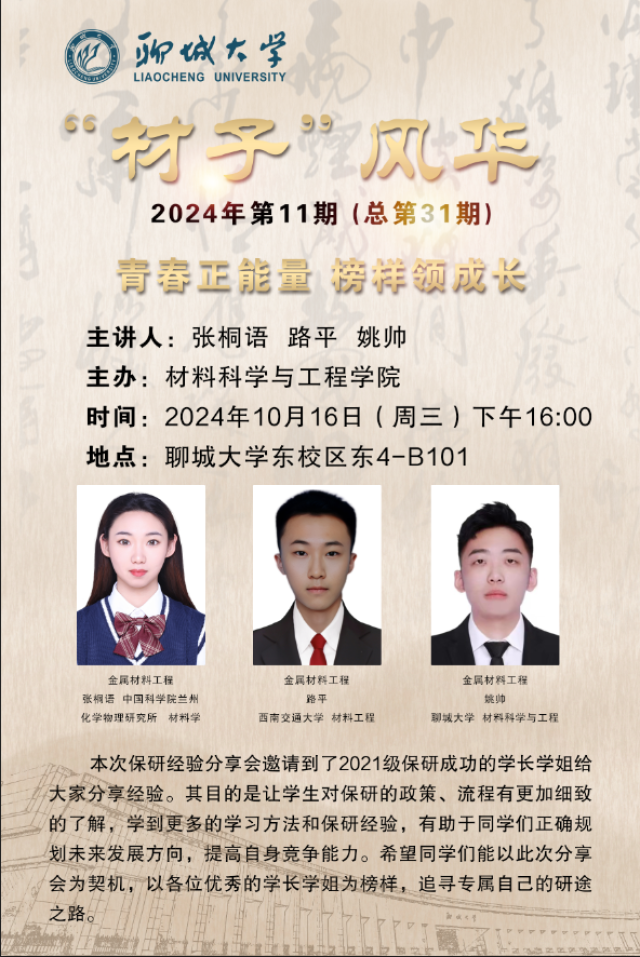 2024年10月16日,信誉最好的十大体育平台于东校区4#B101举办保研推免交流会。此次交流会特邀三位2021级金属材料工程专业成功保研的优秀员工代表张桐语、路平、姚帅,为同学们分享他们宝贵的保研经验与心路历程。