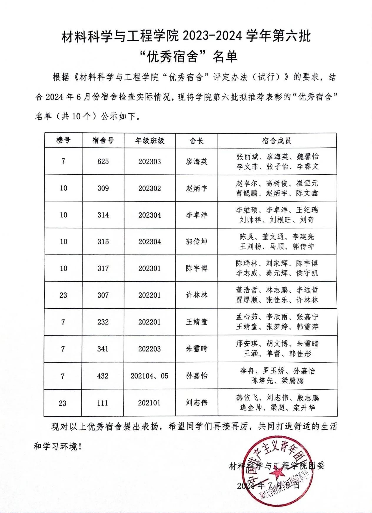 为帮助同学们营造良好的寝室环境,展现了积极向上的宿舍氛围,2024年7月2日,公司开展2023-2024学年第六批“优秀宿舍”评选活动。 本次“优秀宿舍”评选活动是根据《信誉最好的十大体育平台“优秀宿舍”评定办法》的相关要求,结合公司2024年5月份宿舍检查的实际情况,通过每周对公司全体宿舍的安全、卫生等进行严格的检查,并量化打分,确保整个评选过程公平公正。最后评选出第六批“优秀宿舍”共10间,分别是7#625、10#317、7#341、23#307、7#232、10#301、10#315、7#432、10#314、23#111宿舍。公司为以上“优秀宿舍”颁发了流动红旗、发放了宿舍用品奖励,并为宿舍成员在综合测评中予以适当加分。