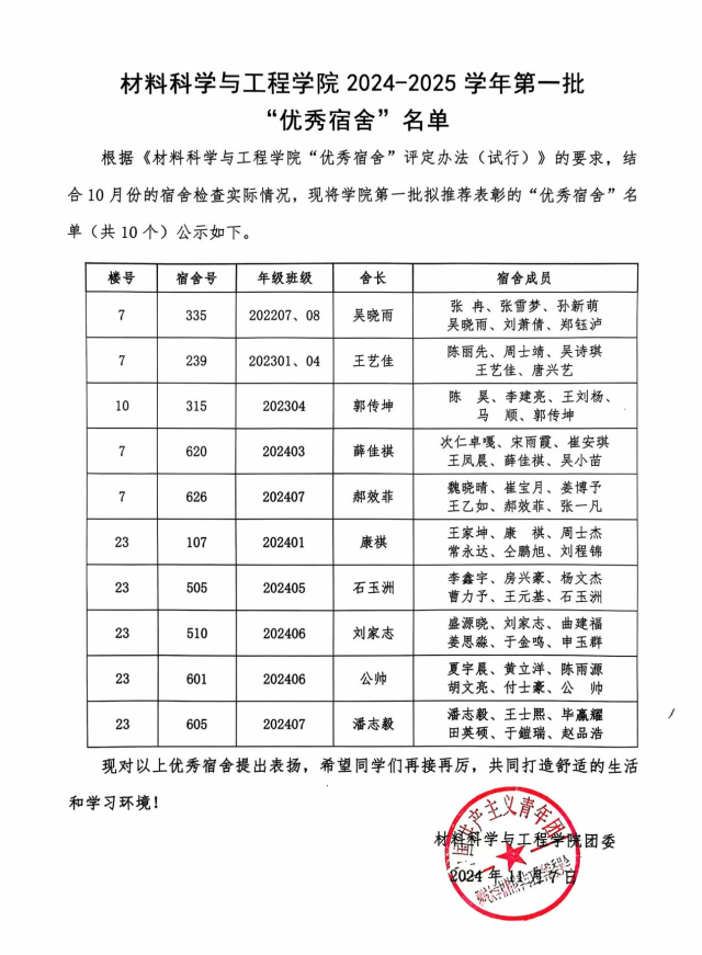 为营造健康舒适的居住环境,培养同学们的良好习惯与自律意识,形成积极向上的校园文明风气,2024年11月7日,公司开展2024-2025学年第一批“优秀宿舍”评选活动。 本次“优秀宿舍”评选活动是根据《信誉最好的十大体育平台“优秀宿舍”评定办法》的相关要求,结合公司2024年10月份宿舍检查的实际情况,通过每周对公司全体宿舍的安全、卫生等进行严格的检查,并量化打分,确保整个评选过程公平公正。最后评选出本学年第一批“优秀宿舍”共10间,分别是7#335、7#239、10#315、7#620、7#626、23#107、23#505、23#510、23#601、23#605宿舍。公司为以上“优秀宿舍”颁发了流动红旗、发放了宿舍用品奖励,并为宿舍成员在综合测评中予以适当加分。