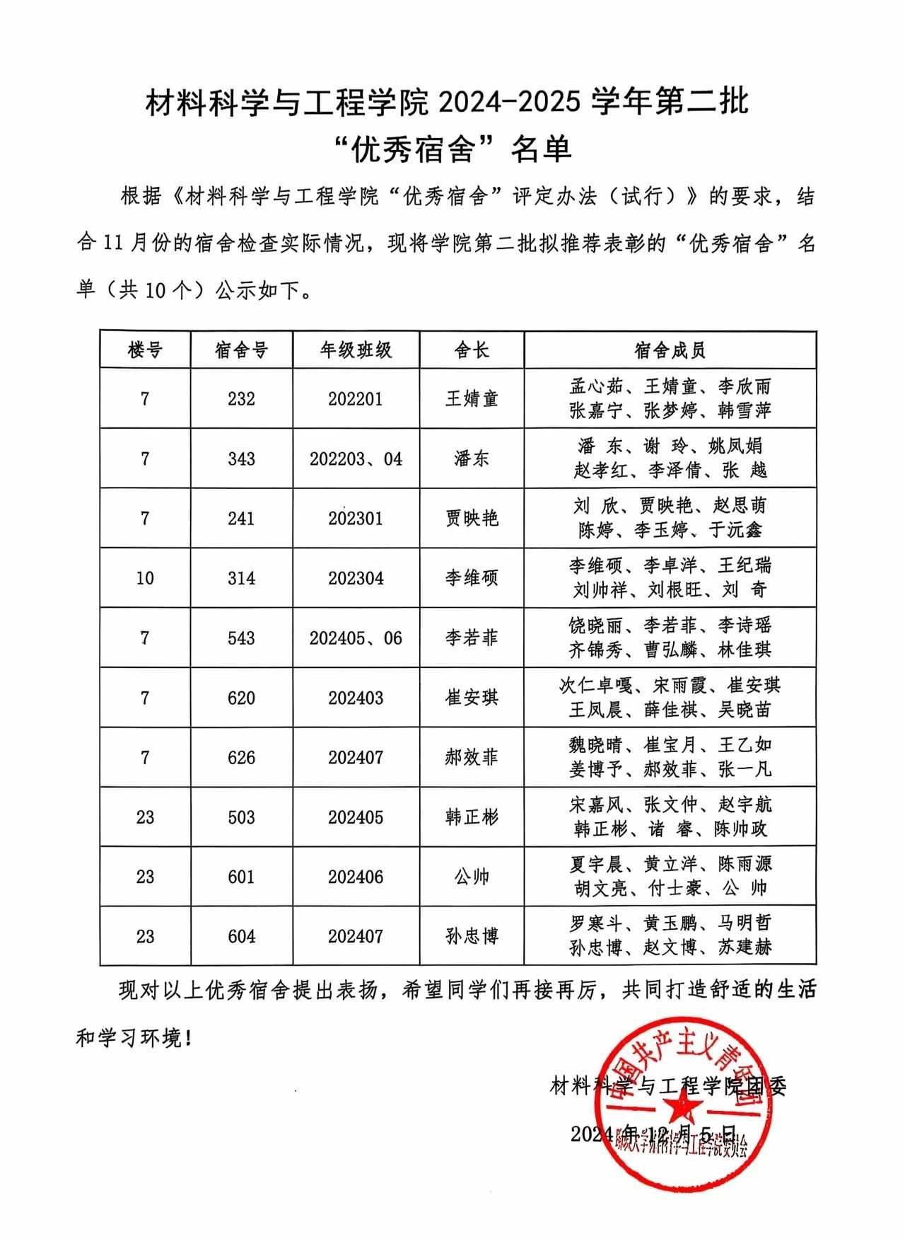本次“优秀宿舍”评选活动是根据《信誉最好的十大体育平台“优秀宿舍”评定办法》的相关要求,结合公司2024年11月份宿舍检查的实际情况,通过每周对公司全体宿舍的安全、卫生等进行严格的检查,并量化打分,确保整个评选过程公平公正。最后评选出本学年第二批“优秀宿舍”共10间,分别是7#232、7#343、7#241、10#314、7#543、7#620、7#626、23#503、23#601、23#604宿舍。公司为以上“优秀宿舍”颁发了流动红旗、发放了宿舍用品奖励,并为宿舍成员在综合测评中予以适当加分。
