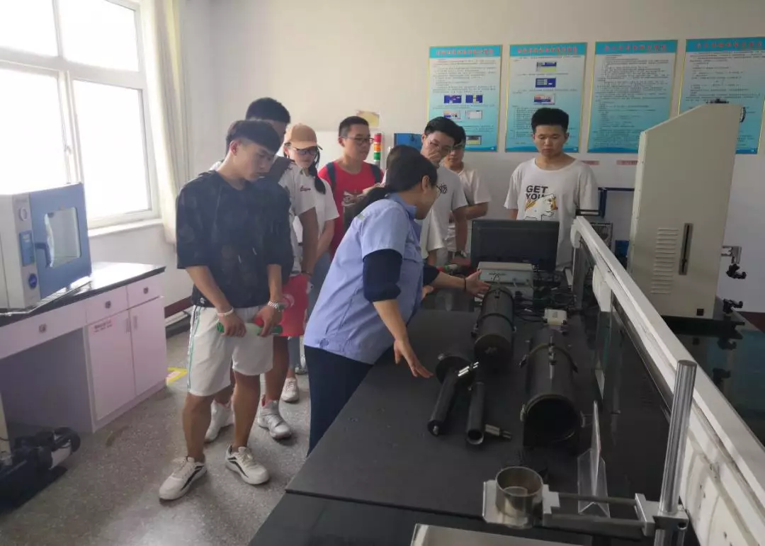 在实践队出发前,指导老师已经为成员们进行充分的理论分析和实践指导。实践队于7月13日来到聊城卓群汽车部件有限公司,在公司张经理、郭经理的带领下深入工厂一线进行岗位实践。张经理向队员们详细介绍了公司的运营情况和主打产品,帮助队员们对“卓群”有了一个大致的了解。随后队员们跟随郭经理来到公司实验室,亲身感受材料专业相关人才工作环境与工作任务,对各式各样的专业检测设备进行简单认识与操作。