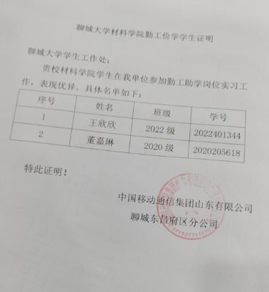 在岗员工在接到公司发布的有关校外勤工助学岗位信息后,积极争取、踊跃参与,并在中国移动通信集团山东有限公司聊城东昌府区分公司参与勤工助学工作期间,表现优异,提升了自身勤工助学能力。