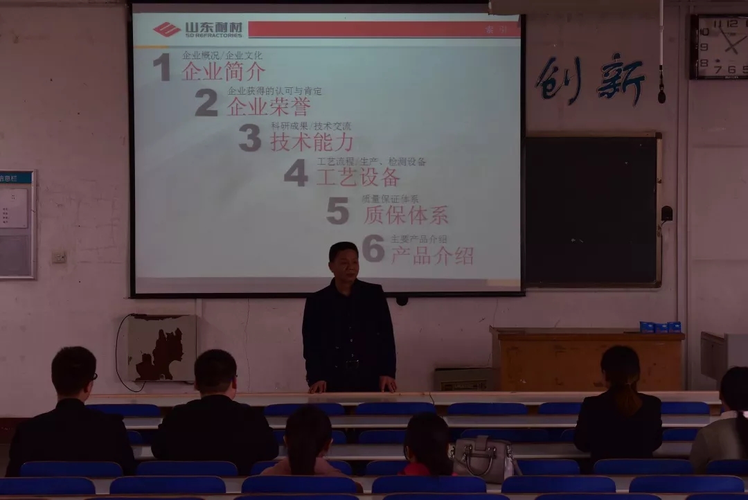 公司是隶属于山东钢铁集团公司的全资子公司,是大型耐材生产企业。公司现有资产净值14.05亿元,占地348.6万平方米,其生产历史始自于1904年,至今已有115年的历史。 公司主要产品有铝硅系耐材、连铸耐材、焦宝石及莫来石料、镁质原料和制品、含碳制品、特耐制品、不定型材料七大类,年生产能力55万吨。公司依托百年企业管理和技术的深厚积淀,以卓越的创新能力和产品品质,致力于为钢铁、建材、化工、电子、有色、军工环保等行业提供优质耐材,是同学们未来就业的一个较好的选择。企业负责人从关于我们、企业文化、企业员工培养模式、企业目前的发展状况及发展前景与同学们作了详尽的分享。